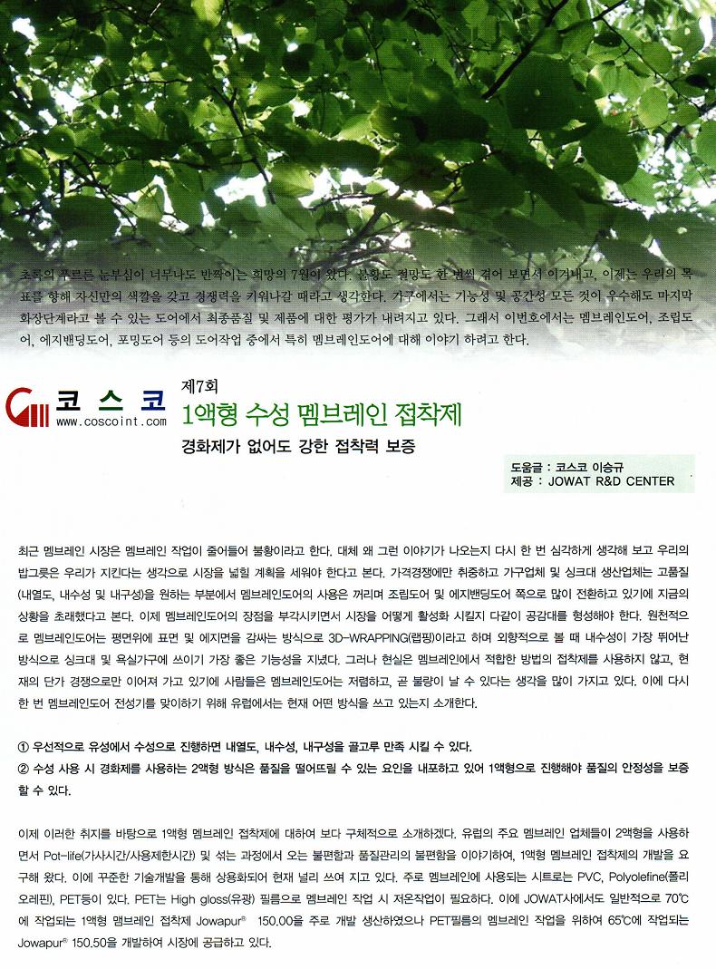 2009³â ¿ì¸® ÄÚ½ºÄÚ ¿¡¼´Â Çѱ¹ »ê¾÷ ¹ßÀü¿¡ ÀÏÁ¶ Çϱâ À§ÇÏ¿© µ¶ÀÏ JOWAT»ç¿Í Çù·ÂÇÏ¿© °í°´´Ôµé²² ÇöÀçÀÇ ½Å Á¢Âø±â¼ú ¹× »ç¿ë¹æ¹ý, ¼¼°èÀÇ º¯ÈÇϴ½ÃÀ嵿Çâ, Á¦Ç°ÀÇ »ý»ê¿¡ ÀÖ¾î °íǰÁú, °íºÎ°¡°¡Ä¡ÀÇ Ã¢ÃâÀ» À§ÇÑ ¹æ¹ý°ú Á¢ÂøÁ¦ÀÇ ÀÌÇØ¸¦ µ½°íÀÚ °¡±¸Àú³ÎÀ» ÅëÇØ ¸Å¿ù Á¢ÂøÁ¦ °ü·Ã ƯÁý±â»ç¸¦ ¿Ã¸®±â·Î ÇÏ¿´½À´Ï´Ù.